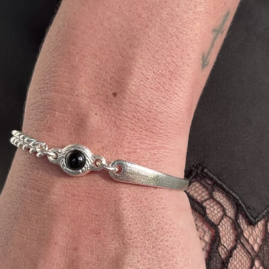 Ethically and consciously crafted from 100% recycled solid sterling silver. This bracelet features a black onyx cabochon gemstone.