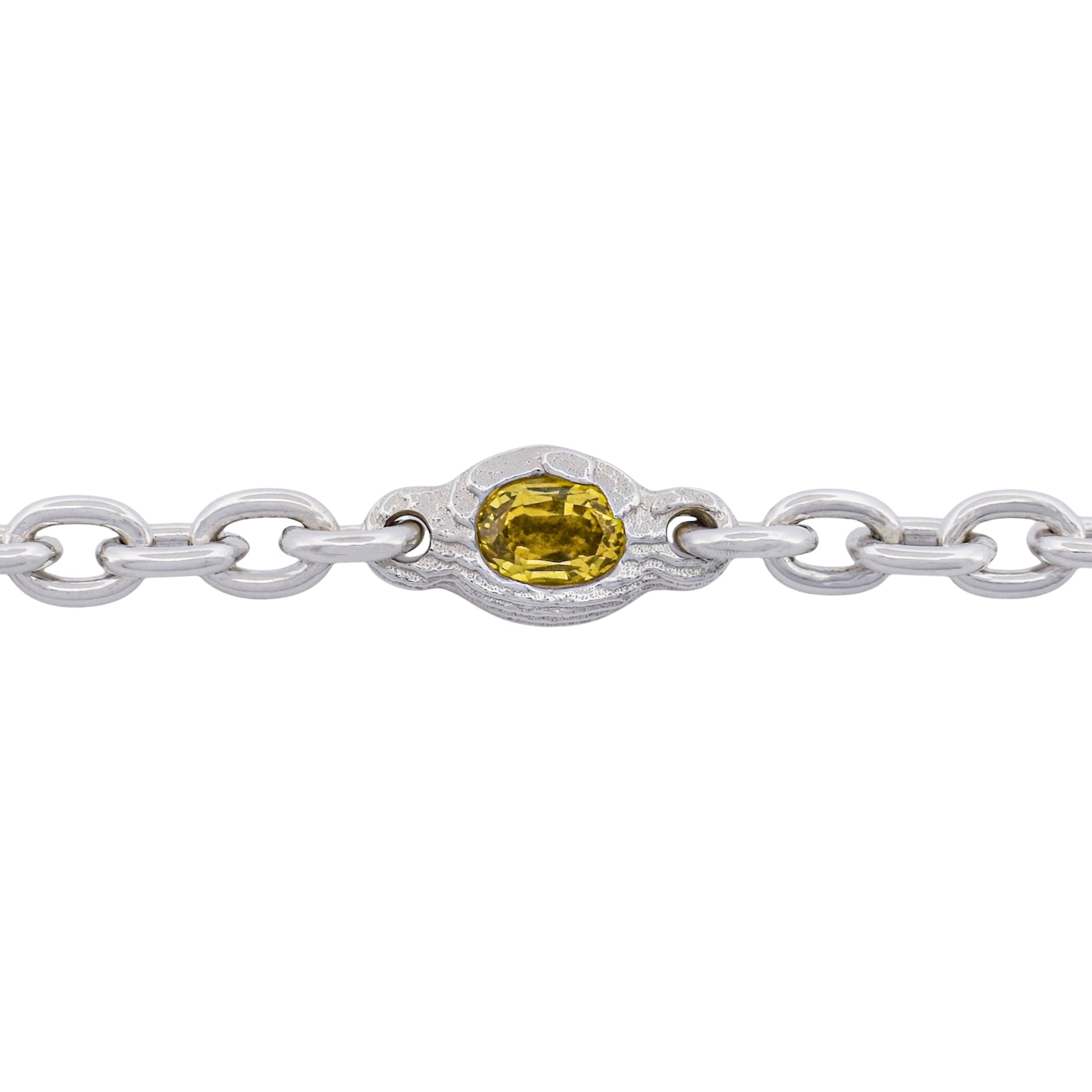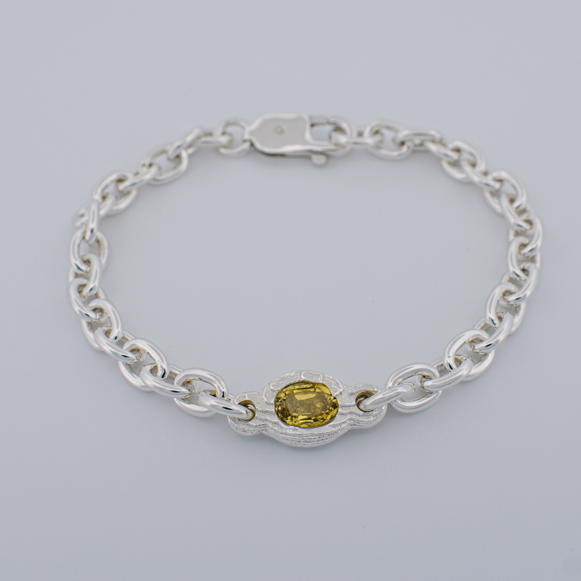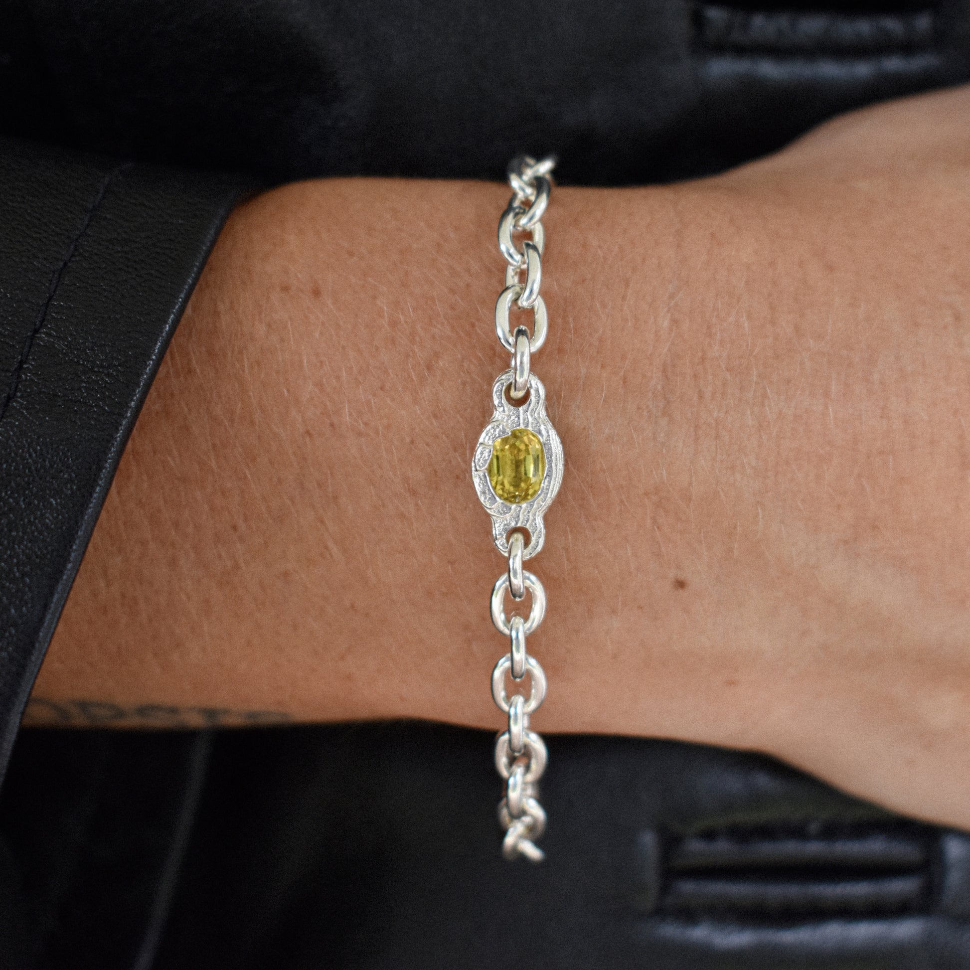 Ethically and consciously crafted from 100% recycled solid sterling silver. This bracelet features a lab grown yellow sapphire gemstone.